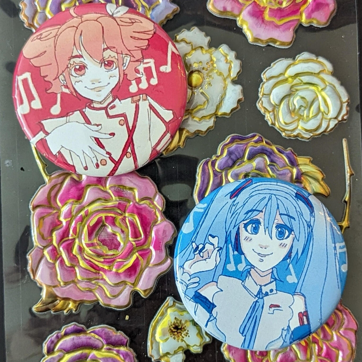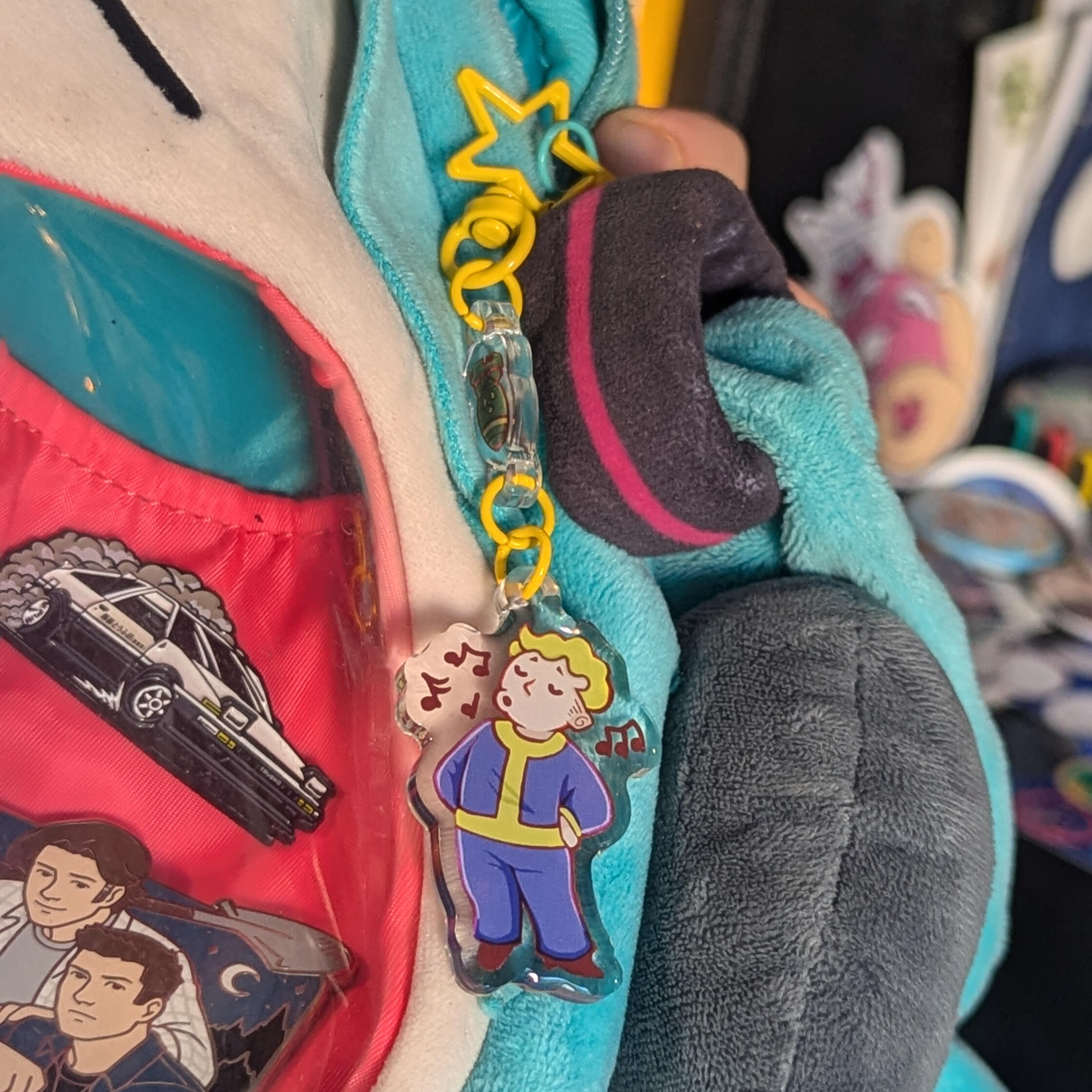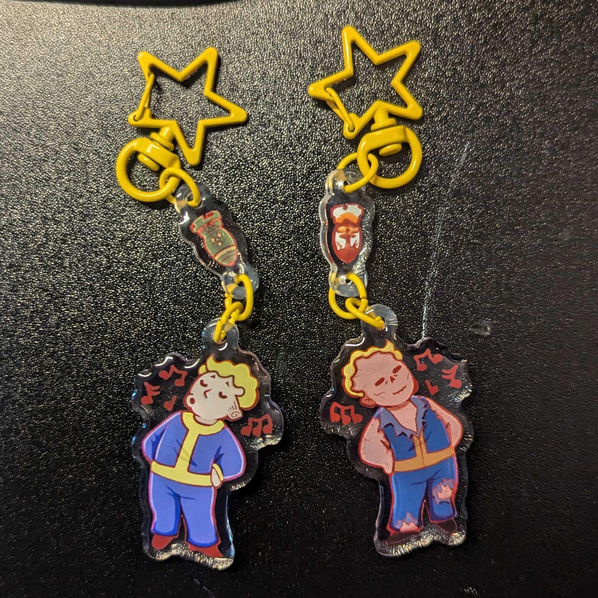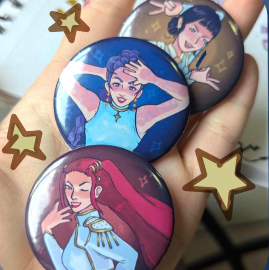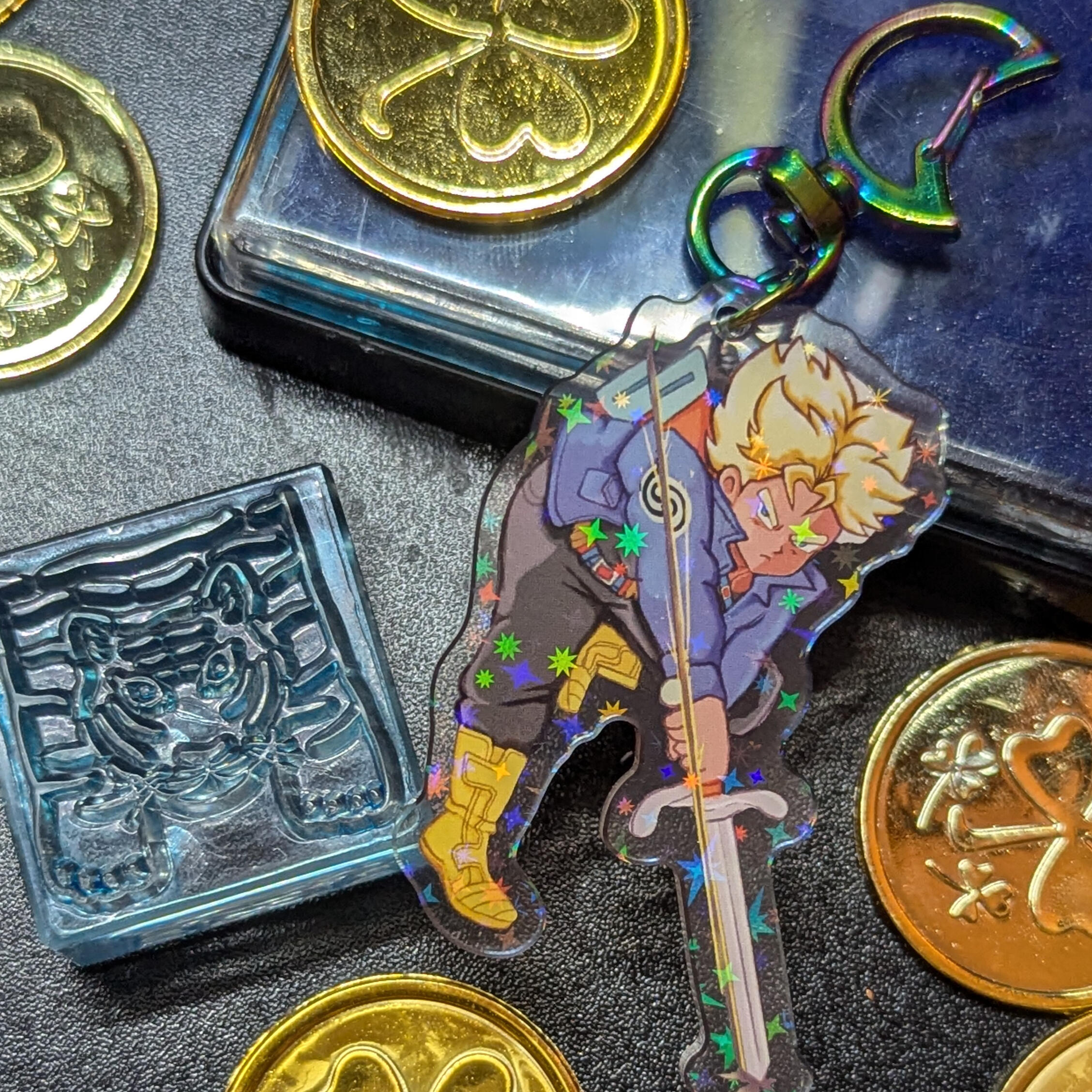 acrylic keychains, wooden pins,
